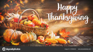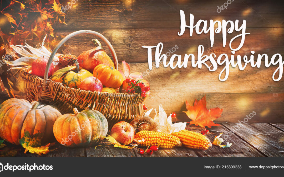Thanksgiving pumpkins with fruits and falling leaves